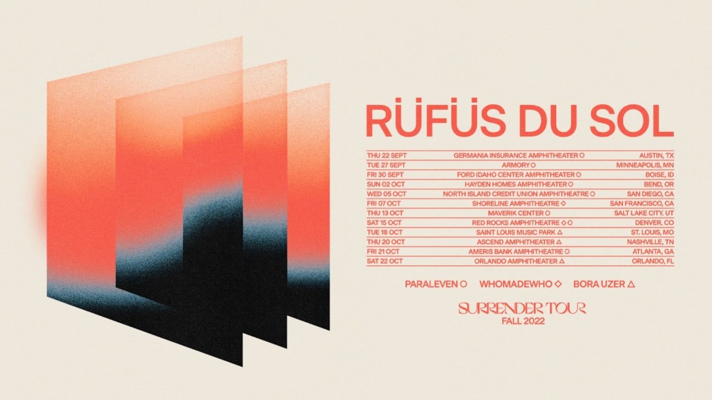 The added September and October dates of the ‘Surrender’ tour kick off in Del Valle, TX at the Germania Insurance Amphitheater on September 22, and wrap on October 22 in Orlando, FL at the Orlando Amphitheater. In between, RÜFÜS DU SOL will travel to esteemed venues like the Red Rocks Amphitheatre in Morrison, CO; Ascend Amphitheater in Nashville, TN; Shoreline Amphitheatre in Mountain View, CA and more.