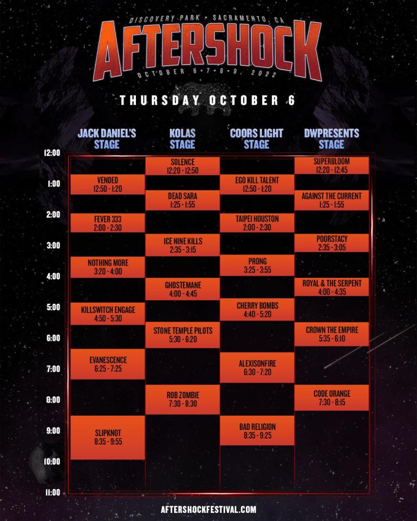 There are just a few weeks left until the West Coast’s Biggest Rock Festival, Aftershock, returns to Discovery Park in Sacramento, CA on October 6-9, 2022 for its 10th anniversary event. Festival producers Danny Wimmer Presents are pleased to announce the music set times, additional onsite entertainment and unique food offerings for the popular event that returns bigger than ever this year, expanding to four full days (after a half 4th day in 2021) and adding a 4th music stage to host a lineup of over 90 bands.