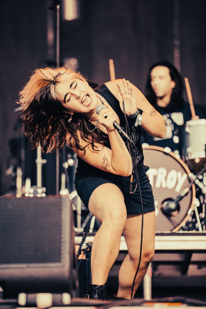 Fit For A King was replaced last minute by The Destroy Boys, due to unforseen circumstances. Coming onto the KOLAS stage this non-binary and female led Sacramento-local band offered up a performance that breathed in a sense of nostalgia for the cool girl-band rock of the eighties with a fresh new twist. The fast tempo of each track continued to build anticipations as the lead vocals sang out the release we all needed regarding tough topics to talk about. The guitarist and backing vocalist expressed their excitement for being onstage as they embraced the crowd that showed their support for the band with open arms.