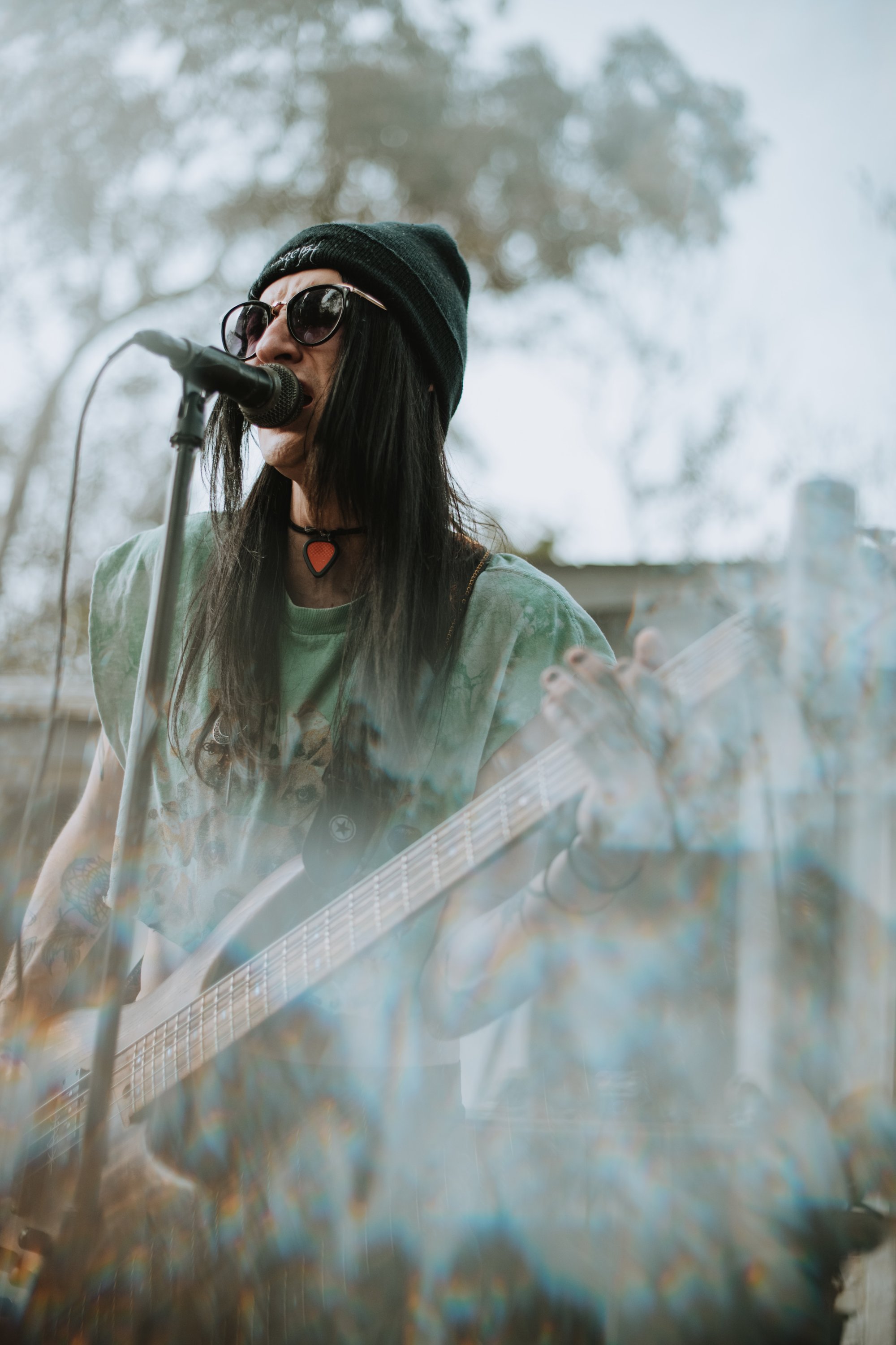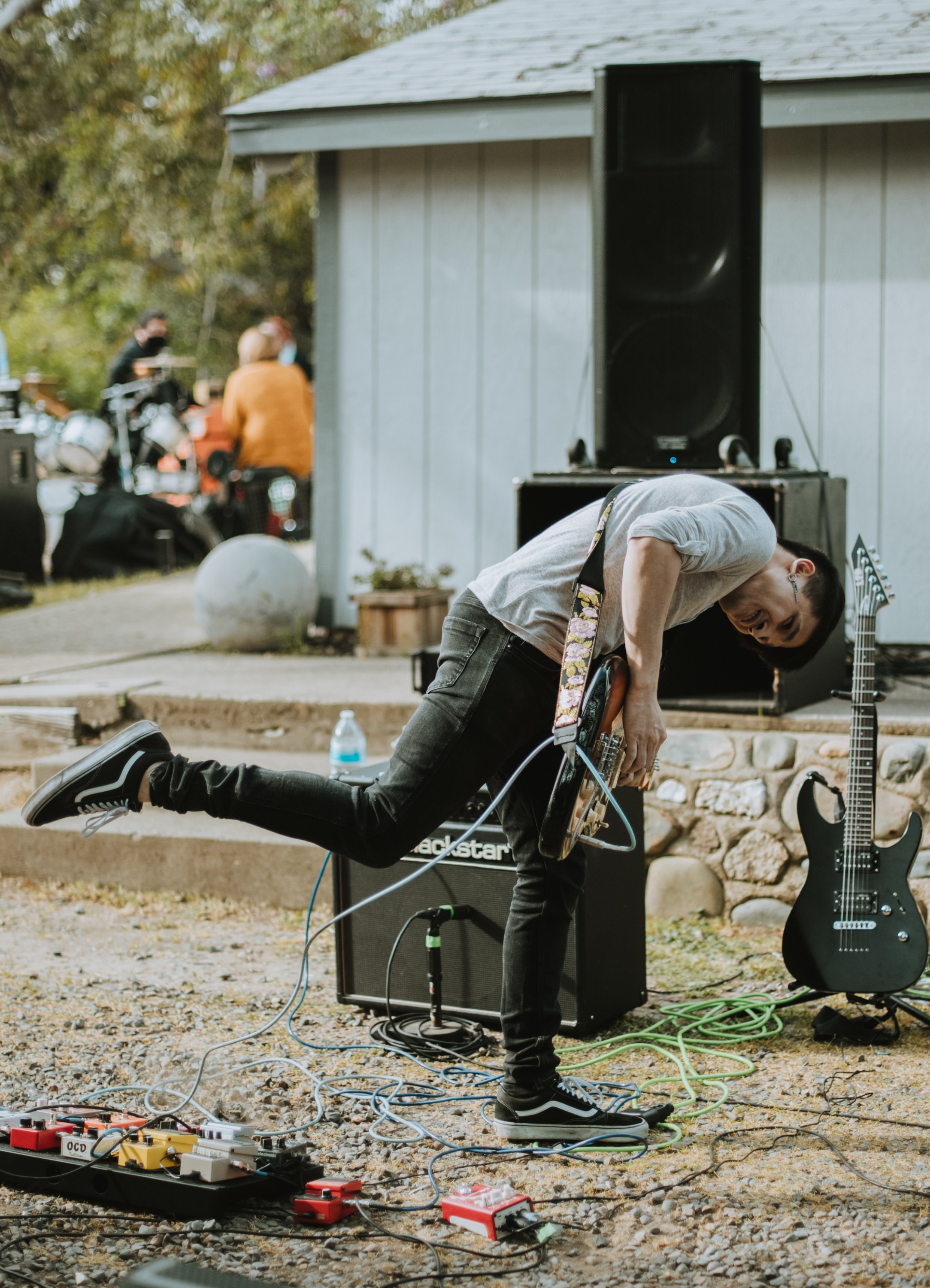 Appearing on the lineup with five other bands– Petroglyphs, XMALXOMX, Here At The End, Fallout Kings, and The Left Hand– the event was created to benefit the homeless community in the area, faced in crisis as the world shut down around all of us. Aquageist energized the crowd with their larger-than-life and practiced presence. Upon stumbling into their work, you would hardly think that they are a new band just crossing the horizon from their first release. And audience and band members alike expressed a near desperation to experience the camaraderie in a love for live performance, human presence, the dust-filled atmosphere of outdoor shows, and music blaring in the ears.
