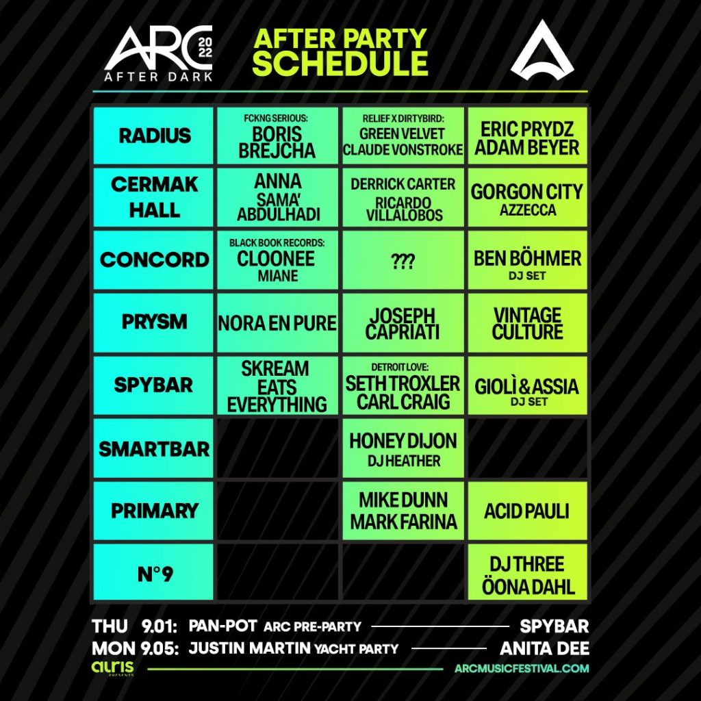 These official ARC After Dark Parties will take place at leading venues across Chicago, which will include events at RADIUS, Concord Music Hall, PRYSM, Smartbar, Spybar, Cermak Hall, Primary, and Nᵒ9 with a mix of artists from the festival lineup and additional acts not on the lineup. Tickets are currently available for ARC pass holders.