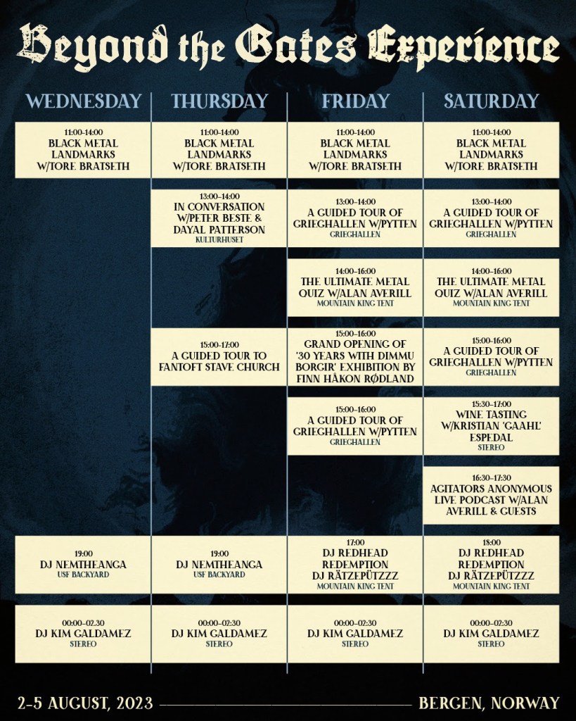 But Beyond the Gates is more than just a music festival. It’s an experience. This year, the festival is offering special guided tours in the heart of Bergen by some of the Norwegian music scene’s own icons. Tore Bratseth, metal legend, and storyteller bar none, will take you on a trip to the outskirts of Bergen to show you a series of key locations in the Norwegian black metal lore. You’ll visit the Lysekloster ruins, where a series of legendary photo and video shoots have taken place, as well as the bunker where Euronymous from Mayhem was photographed for the “De Mysteriis Dom Sathanas” promo cycle. Another stop on the trek is the location of the original Os Rock Club where bands like Mayhem rehearsed before recording “DMDS” in Grieghallen.