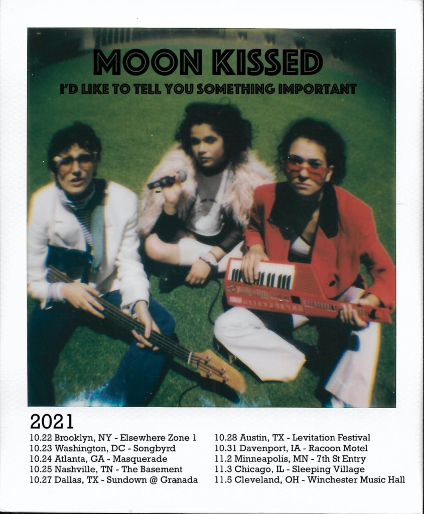 NYC’s Moon Kissed is a not-a-girl band that makes bops that combined intense energy and confident, honest lyrics to establish an environment where it’s okay to be free and weird, but also SAFE. This is paramount for the band, which is more than just a band; with every show they play, they are ushering in a new era of gritty and provocative New York City partying. They create a community where anyone is free to be themselves, gender isn’t real, and the person you’re dancing next to is your best friend but also could be your next makeout partner. With Emily Sgouros on synth, Leah Scarpati on drums, and Khaya Cohen on vocals, Moon Kissed creates energy, an infectious aura, that, if you’re lucky enough to enter it, feels like a secret and an escape, powerful and precious to behold.