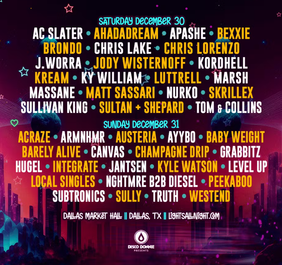 This New Year’s Eve weekend, Disco Donnie Presents is putting on an eletronic dance music festival like no other. The award-winning EDM event production leader will bring Texas’ largest and longest-running EDM festival back to Dallas Dec. 30-31 for the 12th edition of Lights All Night, a one-of-a-kind event featuring a selection of artists that celebrate the past, present and future sounds of EDM. Let’s take a look at what the epically unforgettable weekend has in store!
