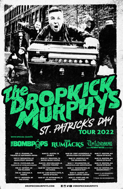 Dropkick Murphys are excited to bring back the tradition of their St. Patrick’s Day Tour in 2022, which will kick off February 21 in Reading, PA and end with the band’s customary run of St. Patrick’s Day week hometown shows in Boston, MA which includes three shows at House Of Blues and one at Roadrunner. Dropkick Murphys are expected to be joined by special guests The Bombpops and The Rumjacks for most shows on the 22-date run. Jim Lindberg of Pennywise will also be a special guest for the March 20 Boston show, to be performed in support of his new Ted Hutt-produced solo album Songs From the Elkhorn Trail.