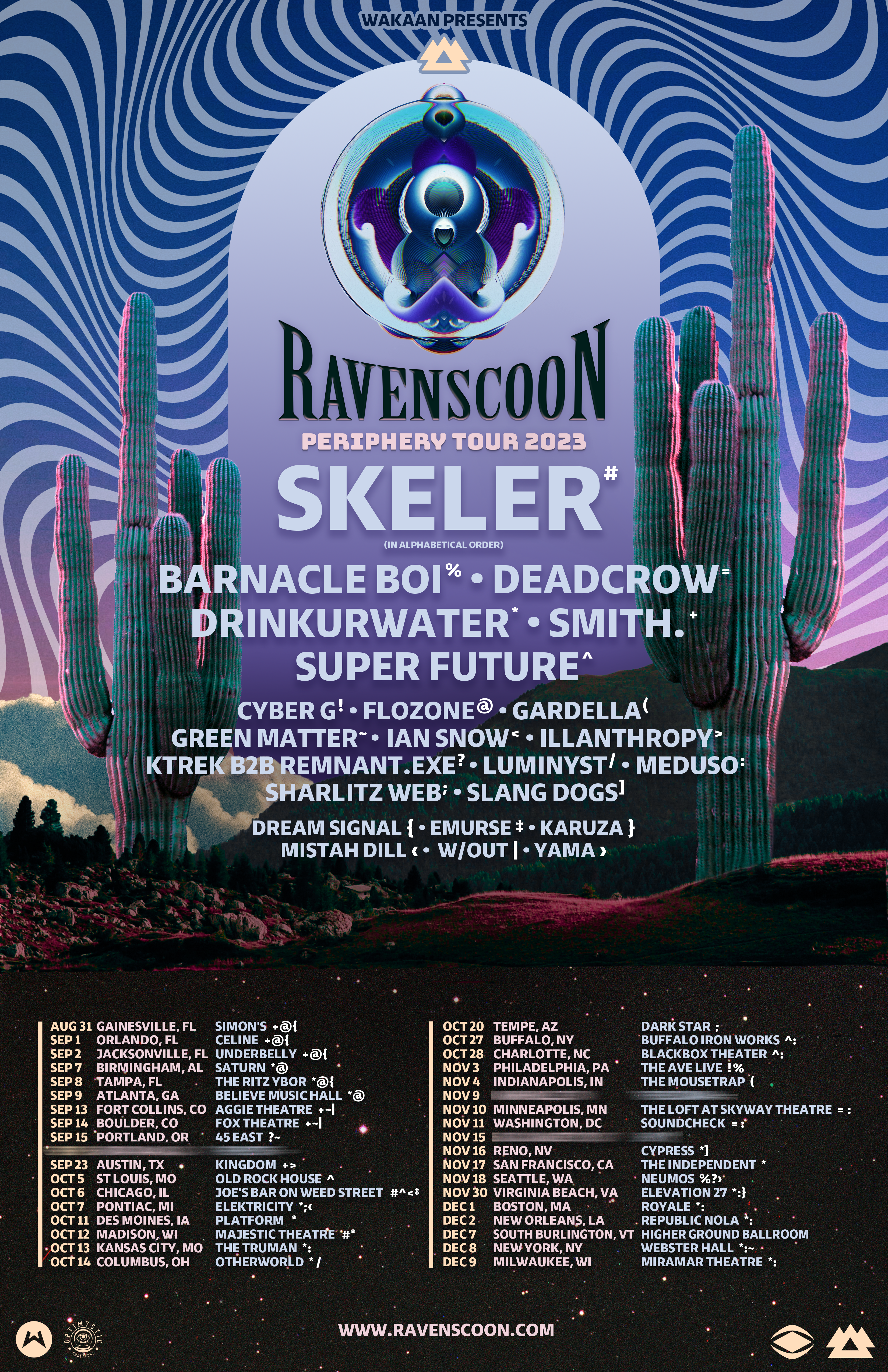 What makes The Periphery Tour different from any other tour is its strategic and massive lineup of guest performers. Ravenscoon will use the tour to promote his album, teasing beats and styles to the audience and building hype for Periphery. Supporting artists such as Skeler, Eazybaked, Deadcrow, Drinkurwater, Smith, Slang Dogs, Luminyst, Dream Signal, Emurse, and many more will join in on everything that Periphery has to offer.