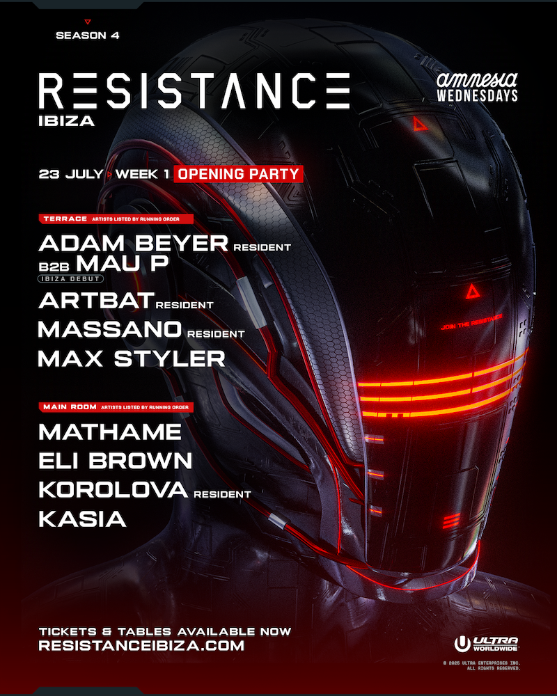RESISTANCE Ibiza will open up its gates on Wednesday, July 23 with its iconic, official Opening Party. The event will bring us the long awaited Ibiza Debut of Adam Beyer B2B Mau P on the Terrace. Moreover, the RESISTANCE Ibiza 2025 Opening Party will also feature ARTBATMassano, and Max Styler on the Terrace, with MathameEli Brown, Korolova, and Kasia setting the Main Room ablaze.