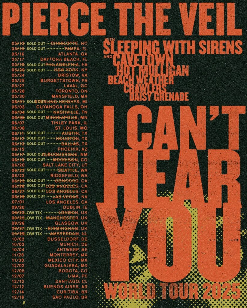 Pierce The Veil’s “I Can’t Hear You” tour hit Concord’s Toyota Pavilion on Wednesday, June 25, delivering an electrifying evening for post-hardcore fans across the Bay Area. Joined by support acts Sleeping With Sirens and Beach Weather, the lineup delivered a dynamic mix of soaring melodies, heavy breakdowns, and emotional anthems, all under a beautiful California evening sky. Toyota Pavilion welcomed a packed house with a festival-like atmosphere. Fans flocked to the lawn and pavilion seats early—many sporting band tees—and the warm, golden-hour sunshine set a perfect tone for a high-energy night. The venue’s versatile layout allowed both die-hard pit-goers and more laid-back listeners to experience the show in their own way.