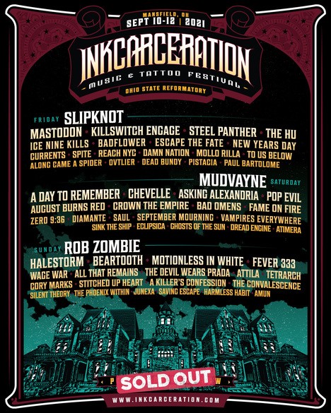 Inkcarceration will feature a massive lineup with some of the biggest names and brightest new stars in rock and metal, including headliners Slipknot, Rob Zombie and Mudvayne (their first show in 12 years), as well as A Day To Remember, Mastodon, Halestorm, Chevelle, Killswitch Engage, Beartooth, Motionless In White, Asking Alexandria, Steel Panther, Fever 333, The Hu, Pop Evil and many more.