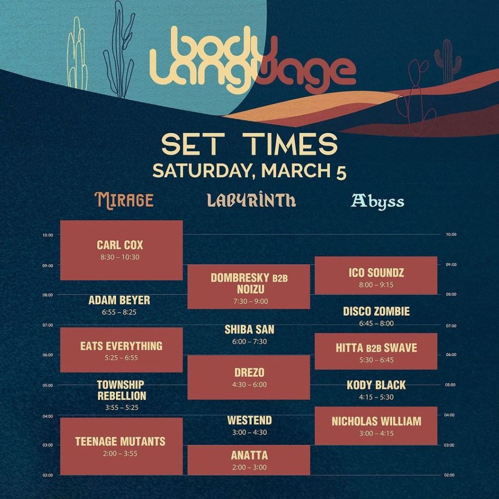 The forecast this weekend looks beautiful – ample sunshine, perfect temperatures, and hypnotic sounds. So grab your friends and dancing shoes and make your way over to Body Language! The set times have been released and tickets are still available at bodylanguagefest.com.