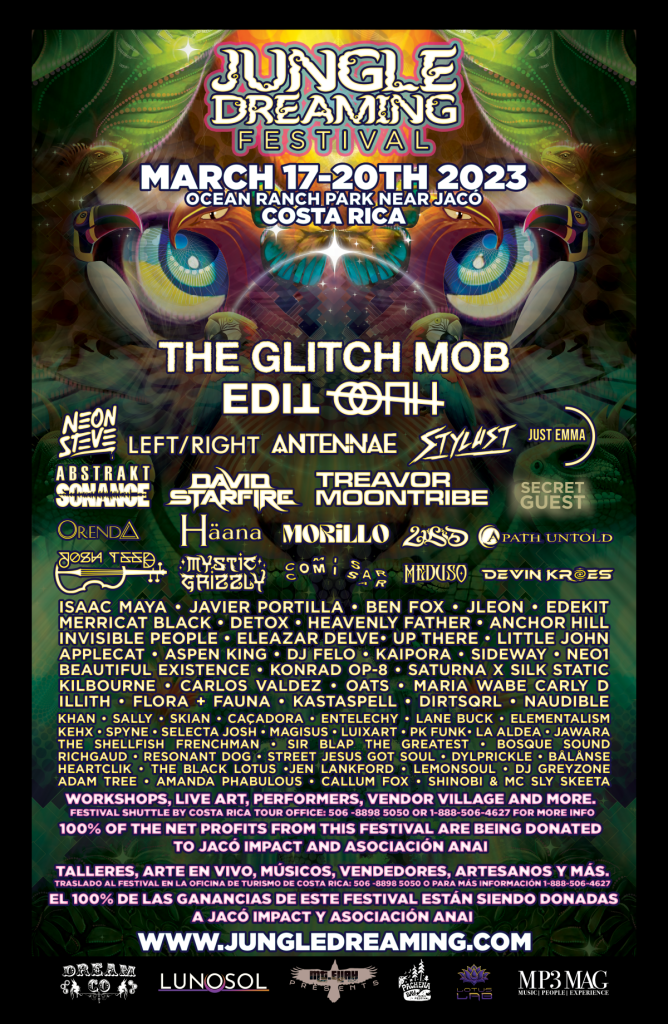 Introducing Jungle Dreaming Festival (March 17-19, 2023), an intimate new music festival launching near Jacó, Costa Rica. Jungle Dreaming invites all music lovers to gather in the Central American jungle this Spring for a one-of-a-kind showcase of art, talent & nature. Here attendees will be treated to an affordable showcase of artistic diversity and inclusive community that harkens back to the origin of these live music gatherings.