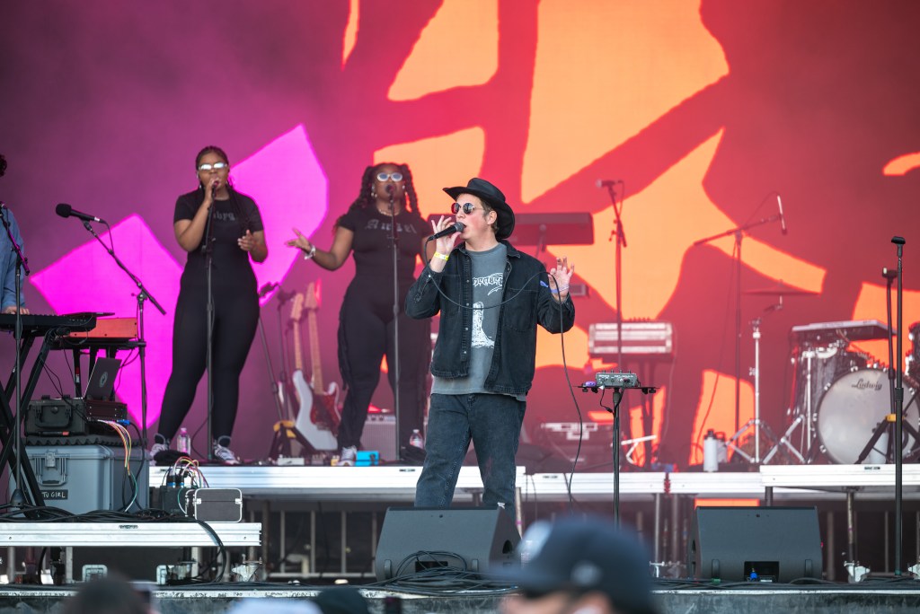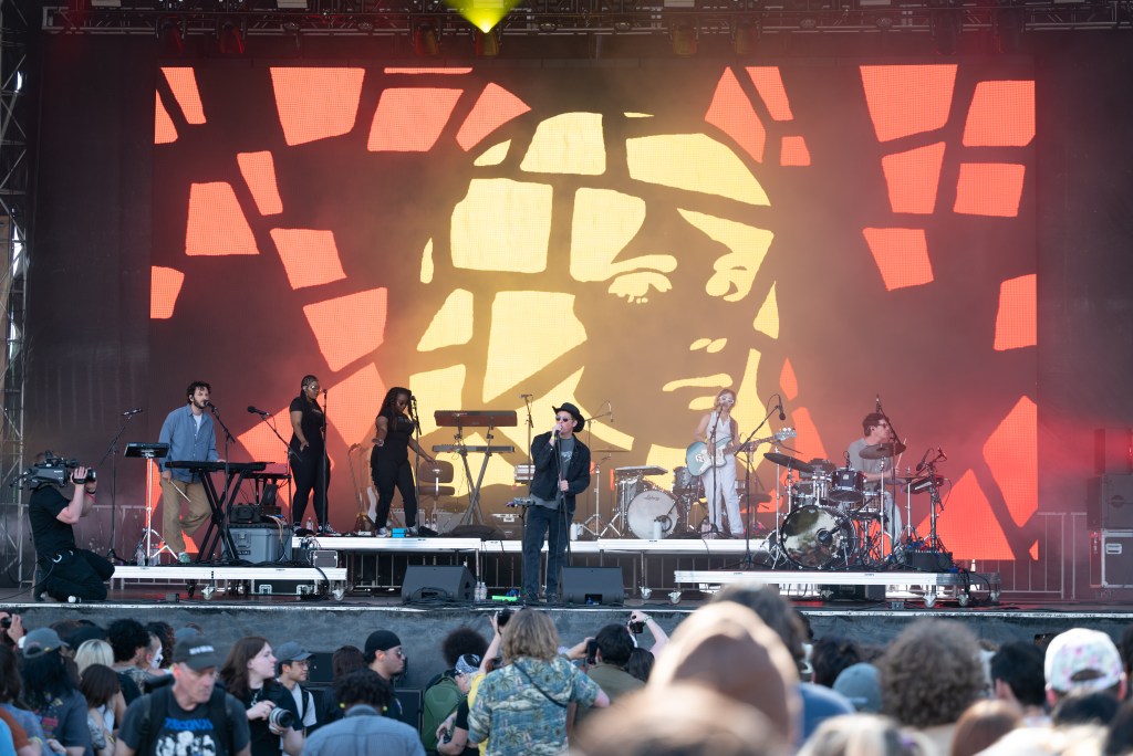 We headed to the Lake Stage to catch LA-based indie pop band, TV Girl! The group, typically consisting of Brad Petering, Jason Wyman, and Wyatt Harmon, brought a few extra faces to form a six-piece for this show. TV Girl powered through a few technical difficulties, with Petering proclaiming at one point, “I’ve been told to keep stalling. How the hell are you, folks???” The crowd didn’t mind, though, as they sang along with songs like “Pantyhose,” “Louise,” and “Birds Don’t Sing.” In the shadow of a stained glass window simulation, TV Girl kept transitioning between songs in the smoothest way possible, only fully stopping when they absolutely needed to. This was a solid start to our day, and it only went up from here.
