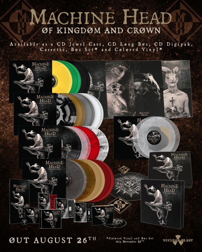 This one’s for my fellow West Coast metal heads! MACHINE HEAD, the absolute metal icon from the Bay Area has released their 10th studio album, ‘ØF KINGDØM AND CRØWN’ via Nuclear Blast X Imperium Recordings. The proportions of this album are absolutely epic: 13 tracks tell a complex story of love and companionship set in a decimated futuristic wasteland where the sky is stained crimson red. The crux of the story is based on two main characters: Character #1 Ares: (pronounced Aries), our main, who loses the love of his life (Amethyst) and goes on a murderous rampage against the vile sect responsible for her murder. Character #2 Eros: (pronounced Arrows) the perpetrator, who loses his mother to a drug overdose and becomes radicalized in the aftermath. Eros goes off the deep end manifesting his own killing spree. The album’s lyrics detail how their lives intertwine. The colossal concept album comes with a list of equally colossal packaging for various physical formats, including 16 different vinyl editions worldwide, a deluxe vinyl box set (with bonus tracks), CDs (both old-school long box and jewel box options), multi-color cassettes, and a limited-edition Digipak with bonus tracks.