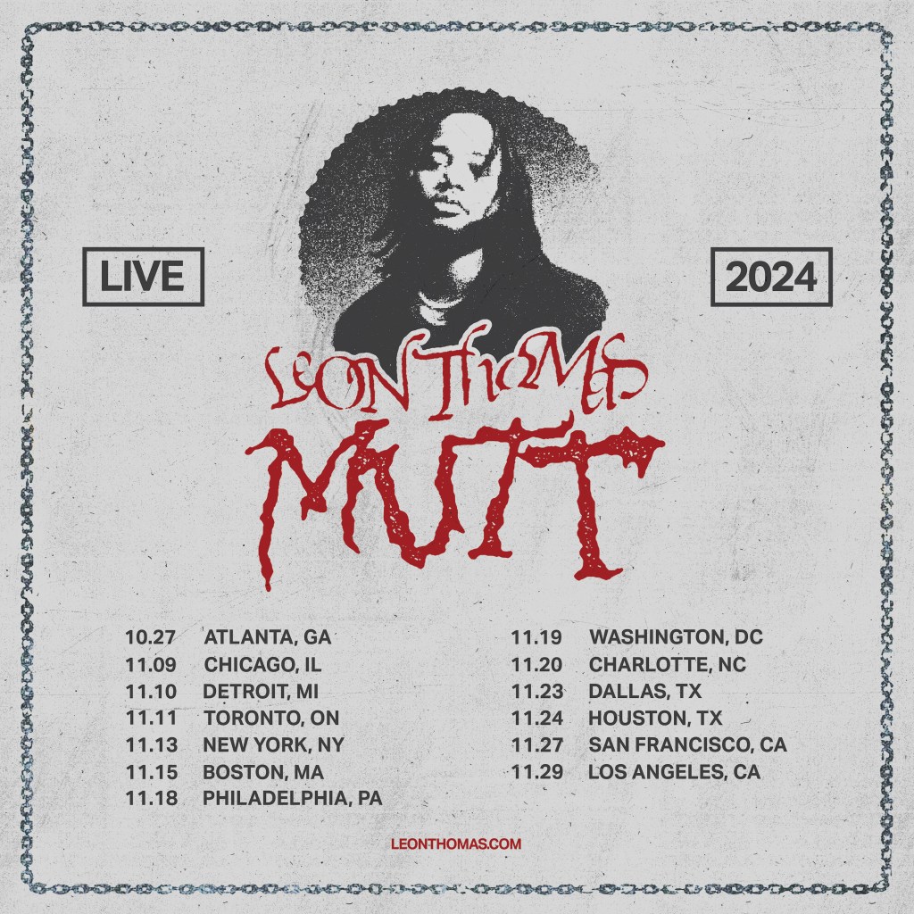 Leon Thomas is set to embark on a North American tour to commemorate the release of his album, Mutt. The album is a vivid exploration of love’s multitudes, diving into the rush of being young and single and the balance that must be found in deep emotional connections. Aside from being an undeniably vulnerable project, Mutt shines because its vibes are immaculate. Get tickets here to immerse yourself in this album live, and listen to Mutt wherever you get your music.
