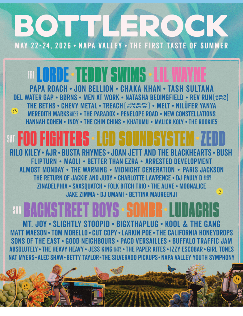 Friday’s headliners include Lorde, Teddy Swims, and Lil Wayne. Meanwhile, additional performances from Papa Roach, Jon Bellion, Chaka Khan, Tash Sultana, Del Water Gap, BØRNS, Men At Work, Natasha Bedingfield, and Rev Run (of Run DMC) round out the day. Together, the bill reflects BottleRock’s signature mix of pop, rock, hip-hop, and legacy acts.