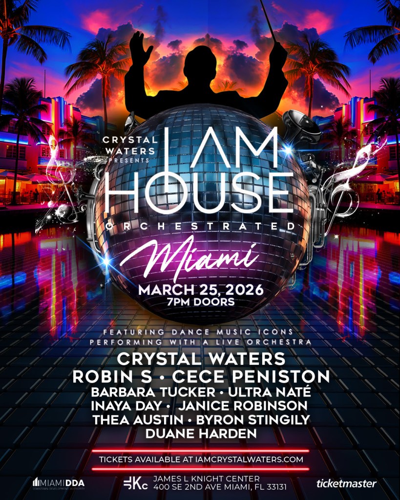 Next, Crystal Waters brings I AM HOUSE Orchestrated to the James L. Knight Center on March 25. Unlike a typical club show, this production pairs house anthems with a full live orchestra.