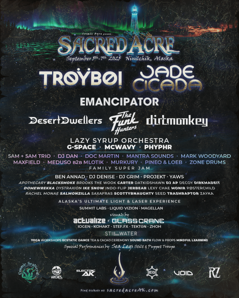 For our fourth entry, we have Sacred Acre, returning for its fourth year of providing world-class electronic music and immersive storytelling, with environmental message. More than a festival, Sacred Acre is a convergence of sound and sustainability, where the bass echoes the urgency of protecting the Bering Sea from factory trawling and bycatch destruction. Hosted in Ninilchik, from September 5 through 7, Sacred Acre promises to be a sanctuary amidst an Alaskan backdrop. From multi-genre producer TroyBoi to sensation Jade Cicada, and DJ Phyphr, on top of many more, this festival is gearing up for greatness. Be part of this movement of music and change and get your tickets now!