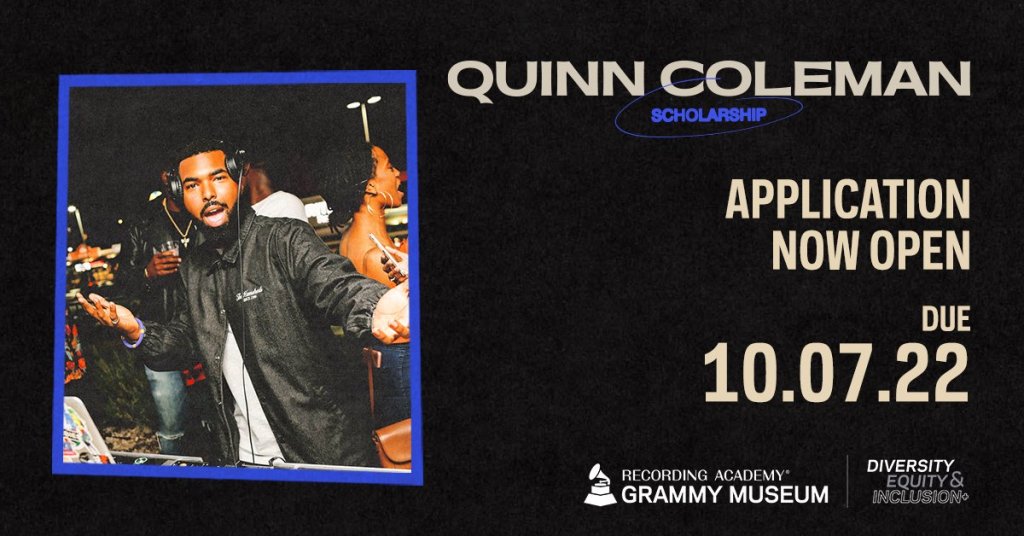 The Academy is currently accepting applications from rising junior and senior college students, in which five candidates will be accepted. Those selected will receive a $1,000 tuition scholarship, two $250 book/equipment stipends, a $500 interview preparation stipend, a Spring 2023 internship with The Recording Academy, and an opportunity to participate in a 6-week immersive program that focuses in emotional and financial wellness–courtesy of the Quinn Coleman Scholarship Fund.