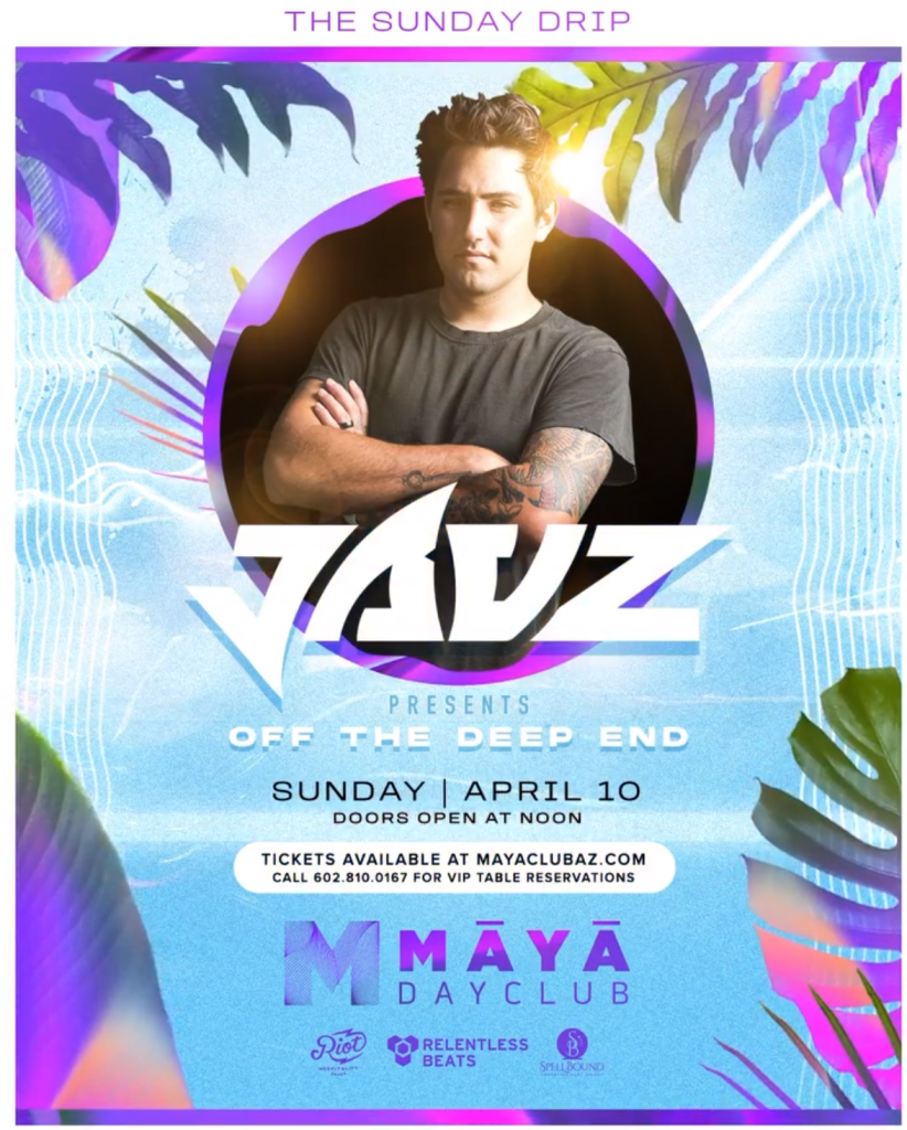 Tickets for The Sunday Drip featuring Jauz presents: OFF THE DEEP END are currently on sale for $30, plus fees. Tickets are available online at www.relentlessbeats.com and mayaclubaz.com. VIP tables are also available by visiting mayaclubaz.com or by emailing vip@relentlessbeats.com. The Sunday Drip is a 21+ event.