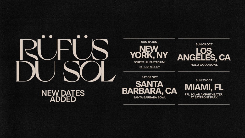 RÜFÜS DU SOL have locked in a third show date in Forest Hills, NY, after selling out two previously released nights at the stadium. In addition, the band has added two major bowl shows at the Santa Barbara Bowl with support from Paraleven and the iconic Hollywood Bowl in Los Angeles with support from Curtis Harding. Finally, to close out the tour, RÜFÜS DU SOL will be performing at the FPL Solar Amphitheater at Bayfront Park in Miami, FL on October 23 with support from Bora Uzer.