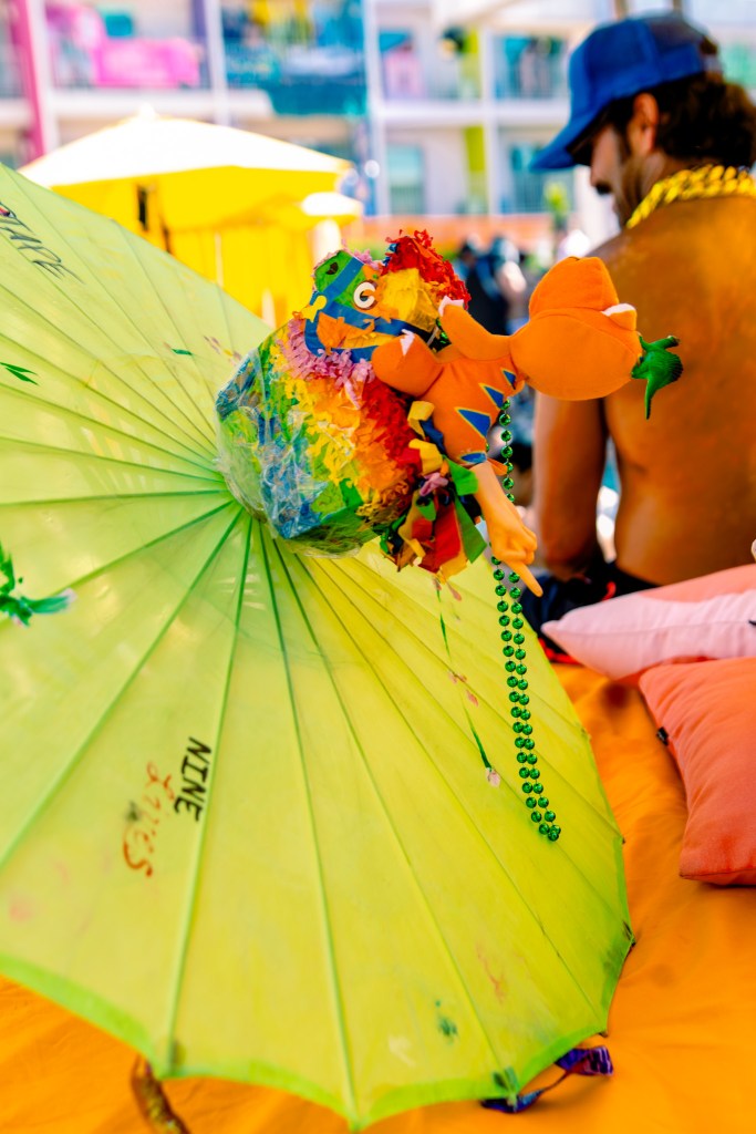 I wound up at Margaritaville and that was definitely where the early party was starting with Cut Snake, whom I had never heard of prior to but was thoroughly impressed with. People were dancing anywhere there was space – on the stage, on the sliver of concrete between the stage and the pool, on top of shoulders within the pool, in the cabanas, and under whatever form of shade existed. There were floaties galore – and rightfully so – amongst the sea of swimsuit-clad partiers, many of whom were dressed in Barbie or Ken clothing because Barbiecore is honestly so integral to the festival scene. Veggi, who was another name I was unfamiliar with, was next on stage and brought two heads of broccoli with him to enjoy the view. Since I had yet to check out the final stage, I made my way over to Saguaro, which might have been the smallest space but it was so much easier to see balcony decorations and there were some fun ones, many of which capitalized on incorporated memes.