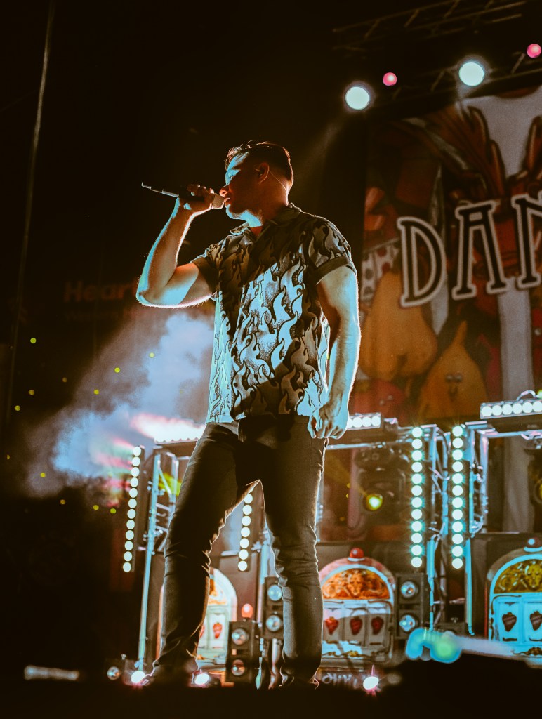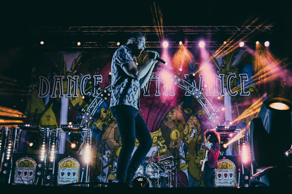 Dance Gavin Dance then left the stage for a short interlude. A new banner dropped as stage lights honed in on the backdrop of Tim’s portrait. A moment of silence rang across the entire park before the band rejoined the stage and began to perform again with vigor renewed. They finished the night off strong, hailing “We Own The Night” as the audience sang along.