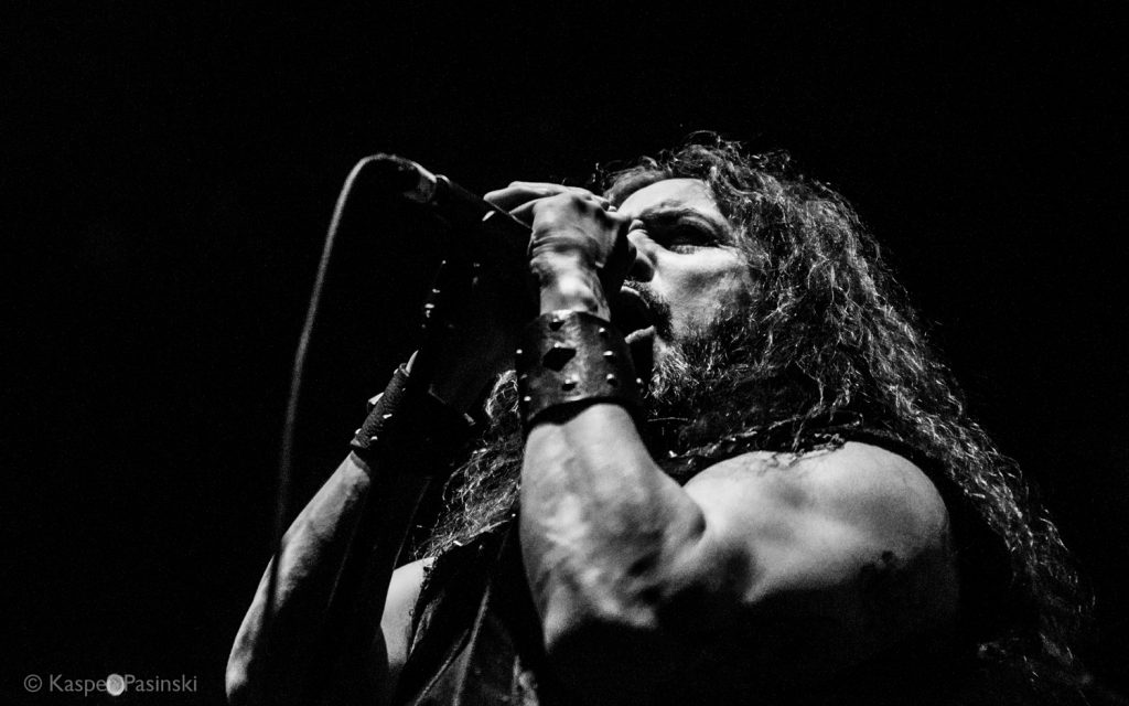 The band stepped on stage also smiling to shortly start the show – Zetro Souza screamed out first lines of ‘Body Harvest’. The band didn’t have a good start – at the end of first track vocals were starting to fade, then we almost completely lost the sound of Holt’s guitar but after short tech’s intervention all was fixed just in time before the band hit the crowd with ‘Blood In, Blood Out’.