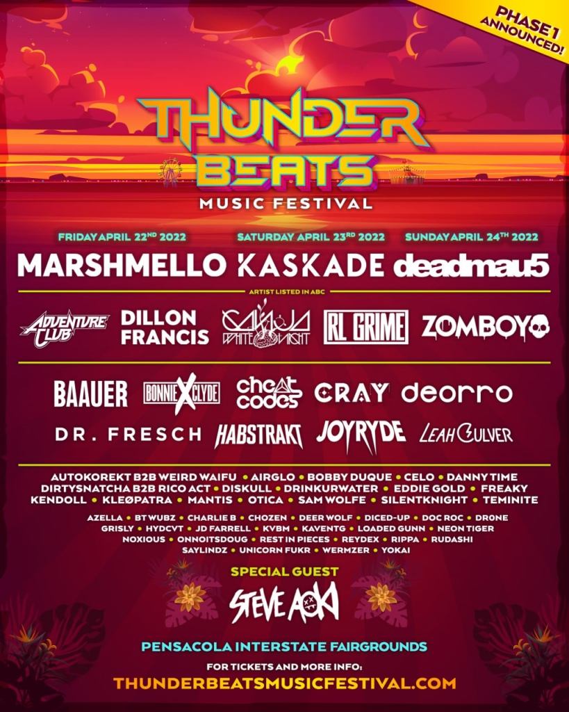 Filling a void in the Gulf Coast, organizers of the inaugural Thunder Beats Music Festival have announced that the biggest EDM festival in the region will be taking place April 22-24, at Pensacola Interstate Fair Grounds in Florida. Presented by Thunder Ranch Entertainment Holdings, the lineup for the festival contains a veritable who’s who in the industry, including Marshmello; Kaskade; Deadmau5; Adventure Club; Dillon Francis; Ganja White Night; RL Grime; Zomboy; Baauer; Bonnie x Clyde; Cheat Codes; Deorro; Dr. Fresch; Habstrakt; Joyryde; Leah Culver, and special guest, Steve Aoki.