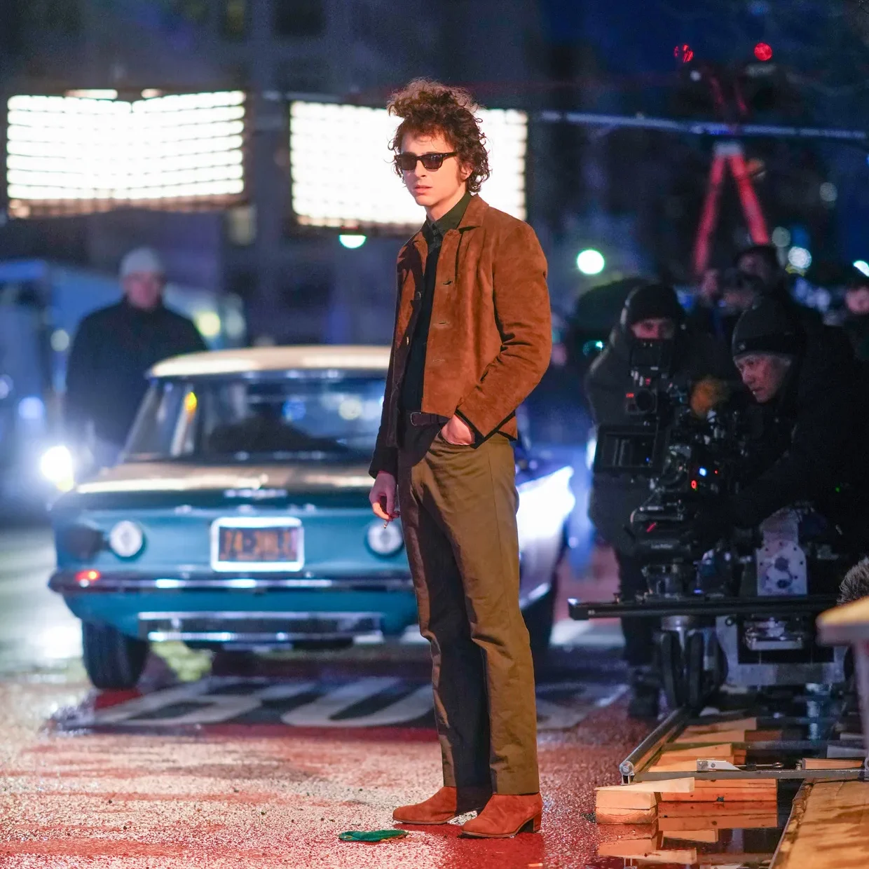 The film will be directed by James Mangold, most recently known for biographical sports drama Ford v Ferrari and Indiana Jones and the Dial of Destiny, the most recent addition to the iconic series. Combining Chalamet’s compelling whimsicality with Mangold’s penchant for engaging narratives, fans are intrigued to see how this pairing will bring Bob Dylan’s story to life in A Complete Unknown. Monica Barbaro and Elle Fanning will star as artists Joan Baez and Sylvie Russo, respectively, each a former lover who undeniably inspired Dylan. The depiction of these pivotal relationships will surely enrich the understanding of Bob Dylan’s sensibilities as a person and musician. Filming started officially this March 2024 in the busy and vibrant New York City, although there is no official release date yet. Timothée donned a matching suede jacket and boots, finishing the look with sunglasses and a cigarette, as shown below.