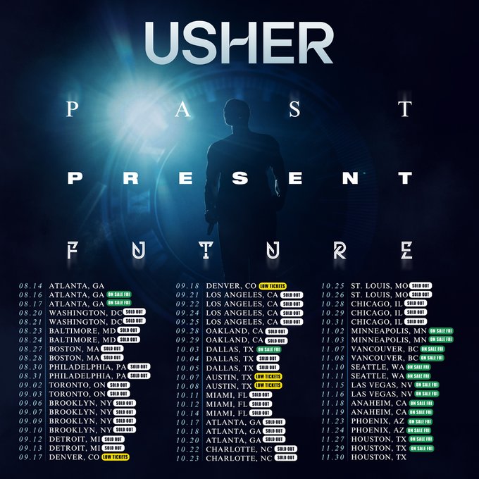Make sure to jot down the dates and prepare to groove the night away alongside Usher as he brings the ‘Past Present Future’ tour to a city near you. Tickets are currently available for purchase, but act fast! With much of the tour already sold out, seats are limited. Don’t miss your chance to secure a ticket before the entire tour sells out.